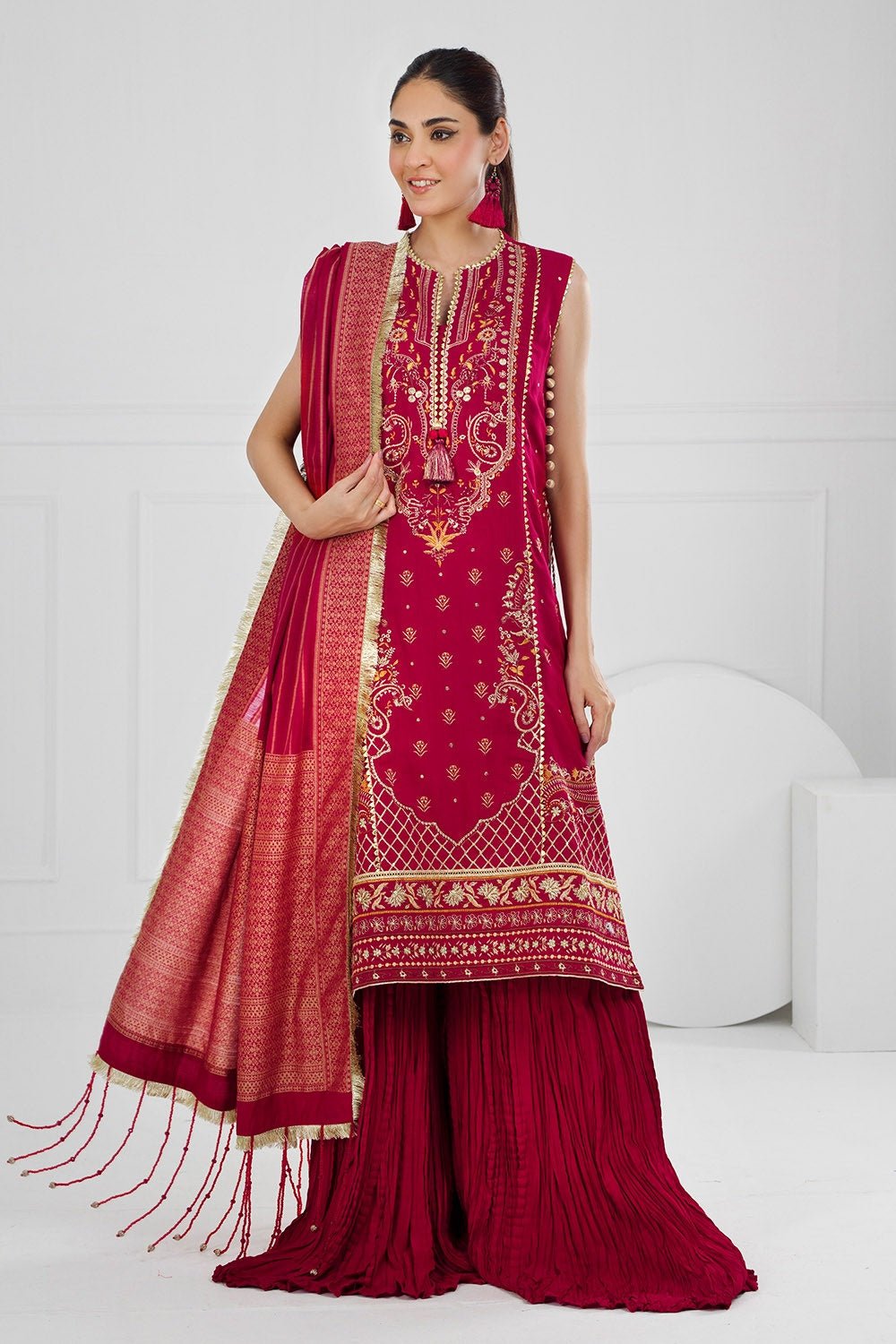 Jacquard Dupatta – 2.5 Meters Embroidered Raw Silk Front Panel, Side Panels & Sleeves with Embroidered Borders for Front & Back. Dyed Raw Silk Back – 2.98 Meters Dyed Raw Silk Trouser – 2.5 Meters